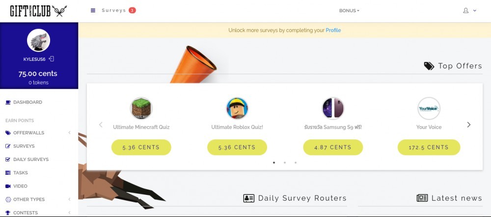 Above you can see a screenshot of the main dashboard. The Top Offers are displayed right in the middle and usually include things like short quizzes, surveys, Etc.